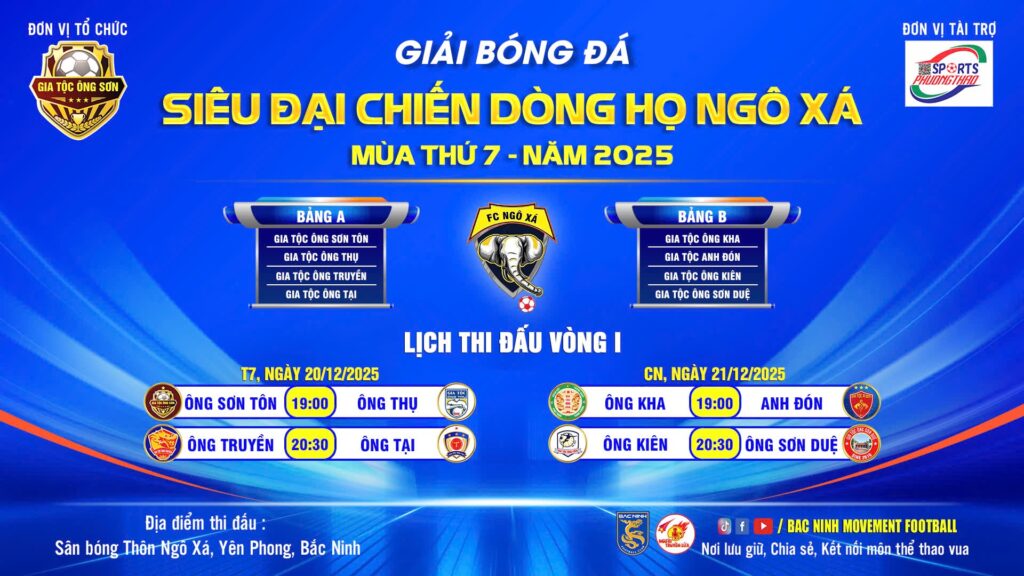 Giải bóng đá Điêu Đại Chiến Dòng Họ thôn Ngô Xá – Mùa 7 năm 2025 sẽ chính thức khởi tranh vào ngày 20/12, hứa hẹn mang đến những trận cầu hấp dẫn, kịch tính và đầy cảm xúc.
